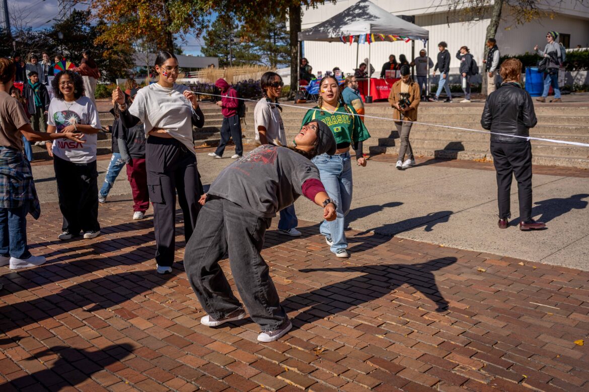 A student makes her way under the limbo rope at the Hispanic Heritage Month 2024 Block Party on October 16th, 2024. Karsten Englander | The Montclarion