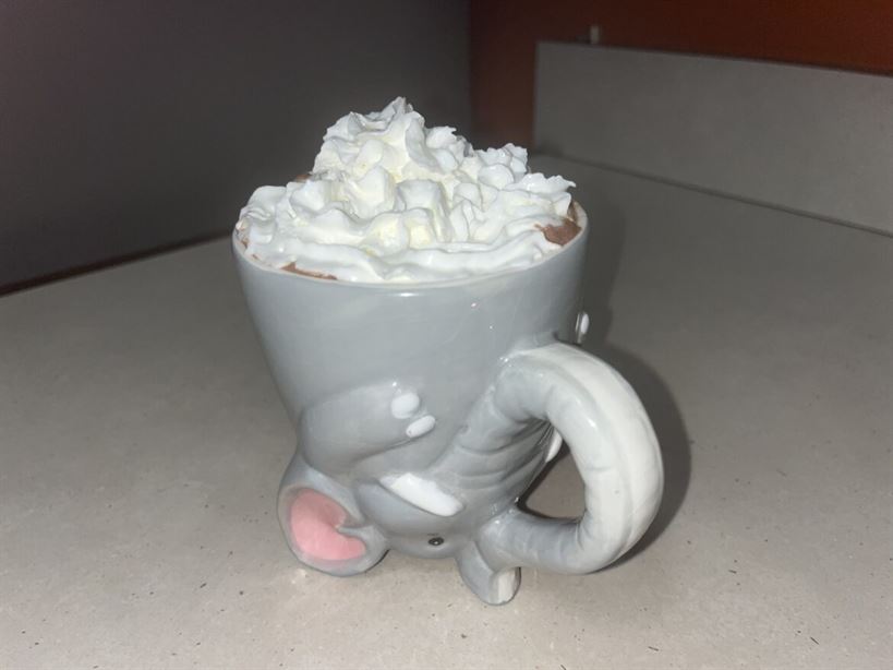 Finally, pour your hot cocoa into the elephant mug your sister bought you. (Shoutout to my beloved sister Abigail. You are awesome and you should come visit me at school). Top with marshmallows, whipped cream, whatever your jolly little heart desires.