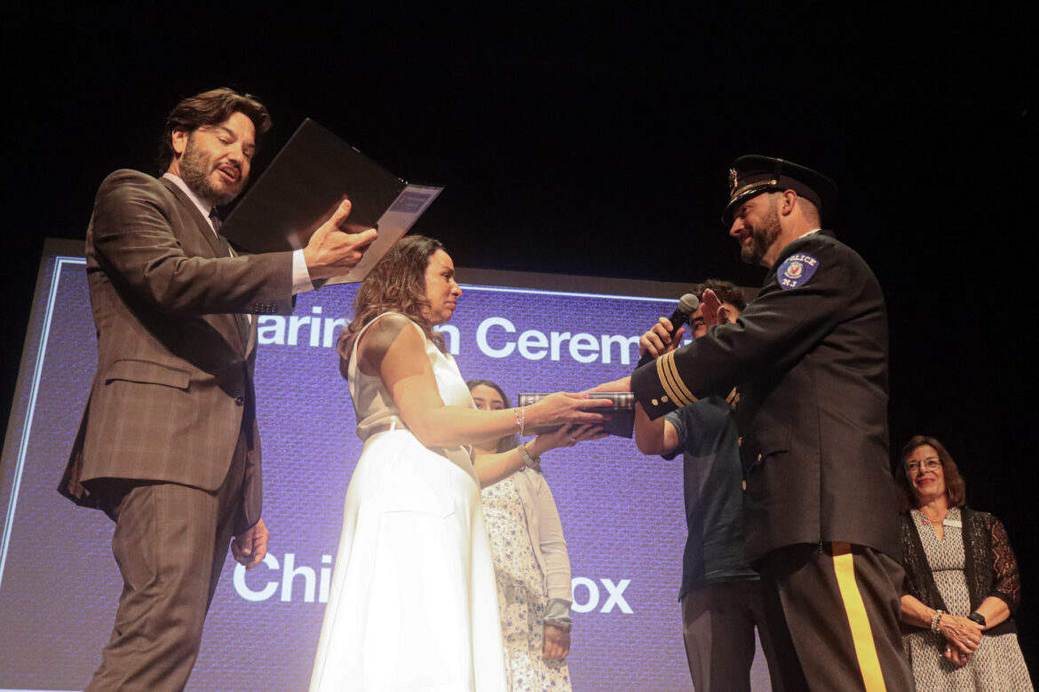Dr. Dawn Soufleris giving chief of police badge on Timothy Fox at the swearing-in ceremony. Emily Ramirez︱The Montclarion