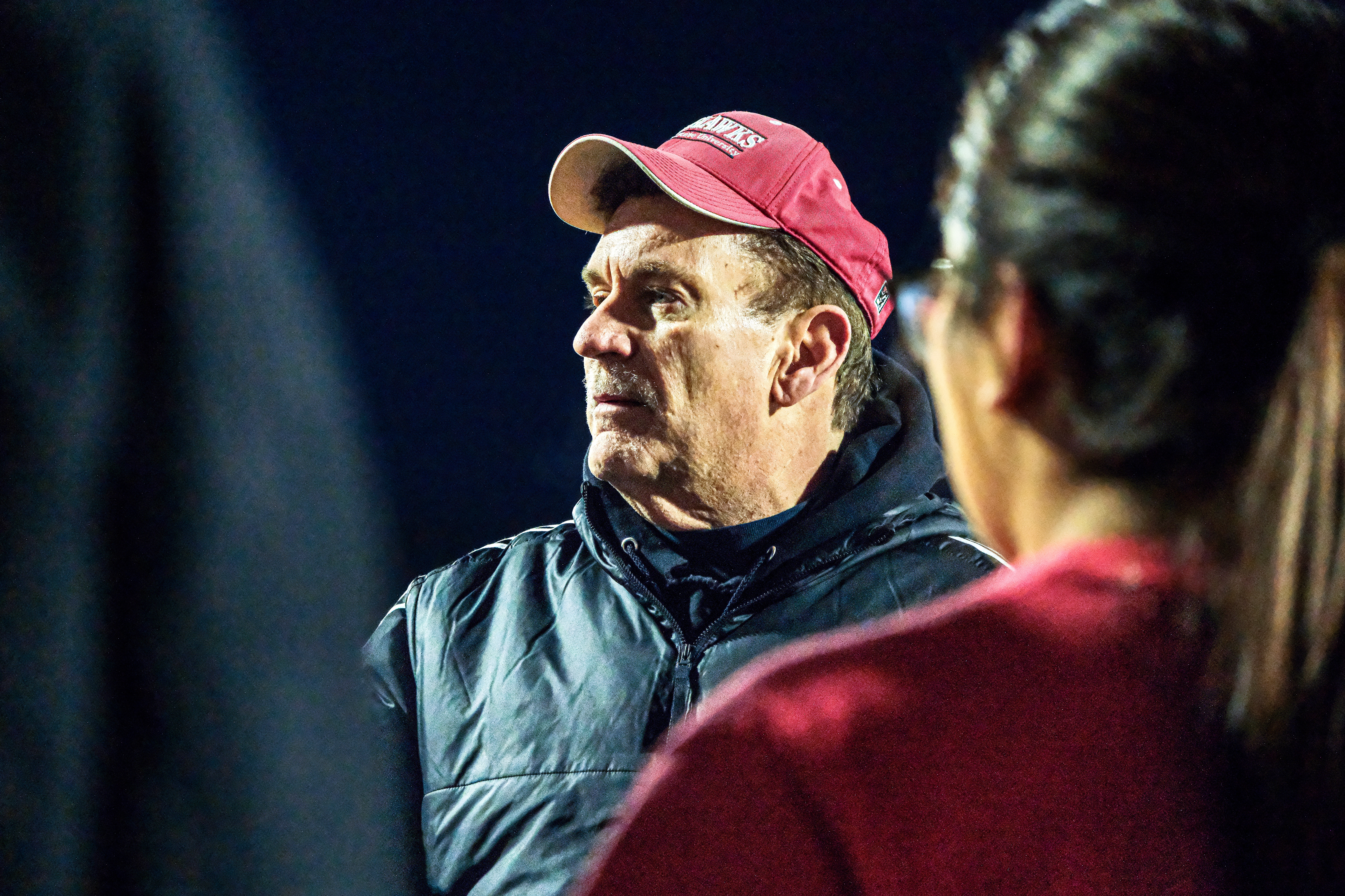 Montclair State flag football head coach Jim Kelly addresses the team after a February 2026 practice. Tim David | The Montclarion