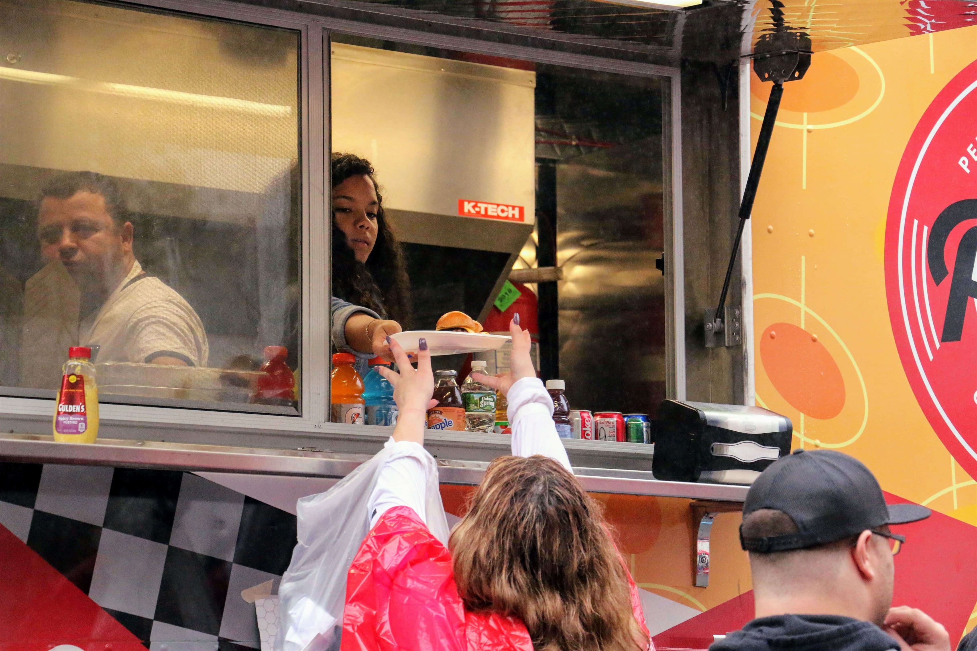 A server in the Pag’s food truck hands a burger to someone at the tailgate. Olivia Kearns | The Montclarion